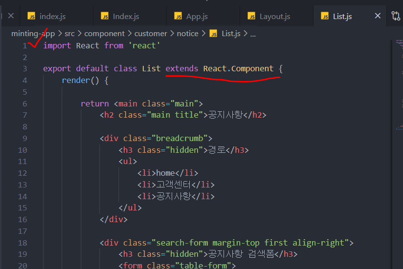 전체 태그를 감싸주는 <div>는 return 옆에 둬야 함!!