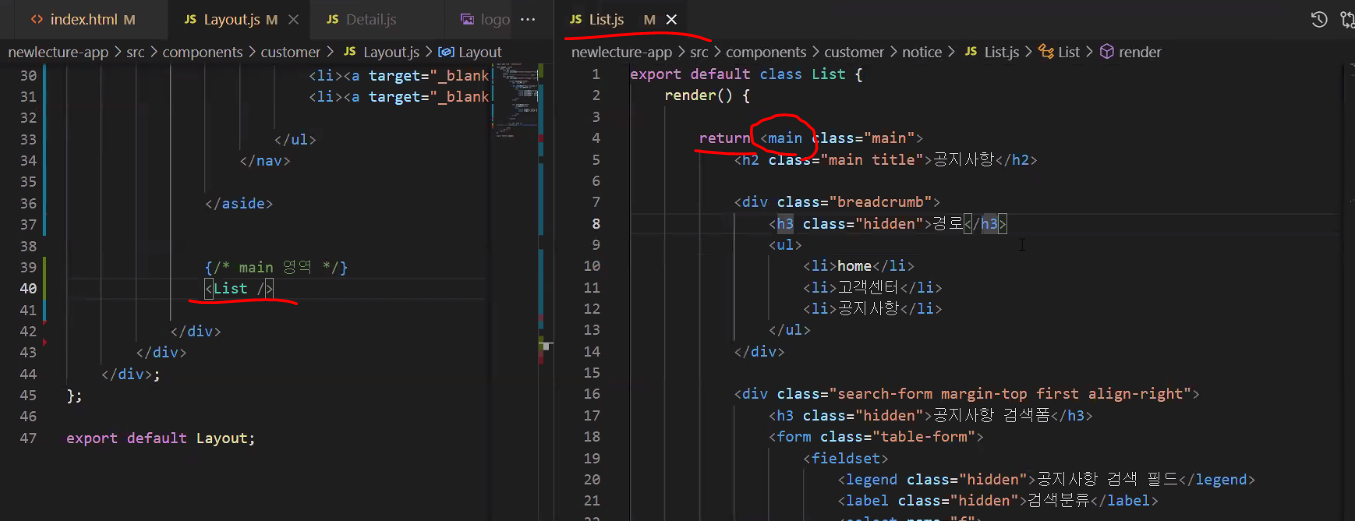 Q. 분명! 뚜렷하게! 아래 </main> 이렇게 닫혀져 있는데 closing 태그 없다고 오류가 남. 다른 태그들도 마찬가지.