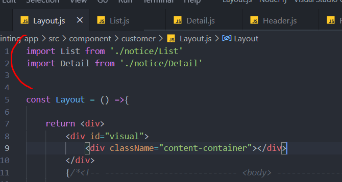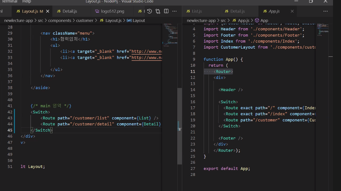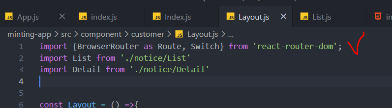 그리고 왼쪽에 switch, route 임포트 맨 위에 해줘야함~!