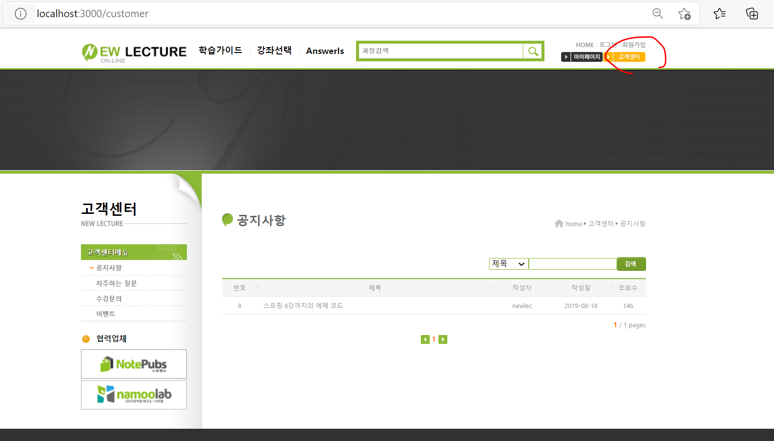 - 지금 상태는 layout.js에 쓴 한글 '공지사항 레이아웃 페이지'만 나오는 상태임.